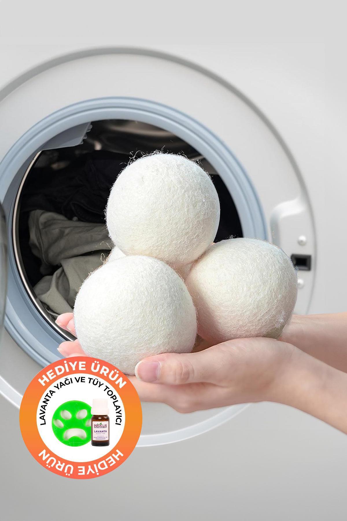 6'lı Yün Kurutma Topu Doğal Çamaşır Yumuşatıcı - Keçe Kurutma Makinası Topları - Kırışık Önleyici, Lavnata Yağ Hediye