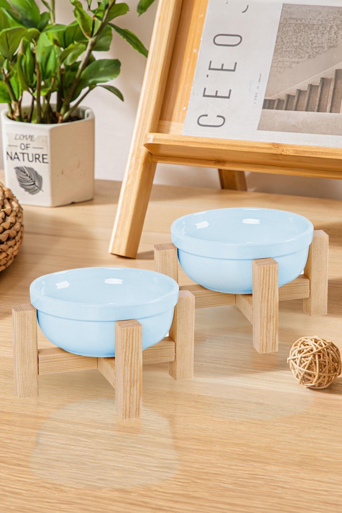 Ahşap Standlı Seramik Dekoratif 2 Adet Kedi Köpek Mama Ve Su Kabı