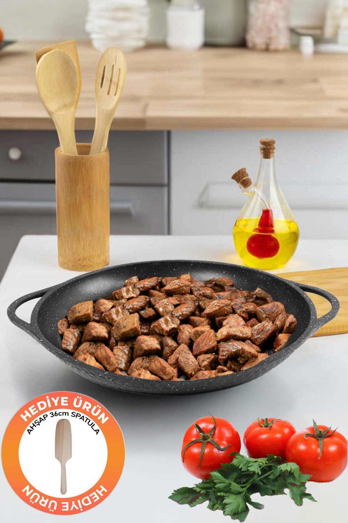 Granit Döküm Kavurma Saç Tavası Balık Tavası, Kavurma Ve Bazlama Tavası Siyah 36 cm Spatula Hediye;